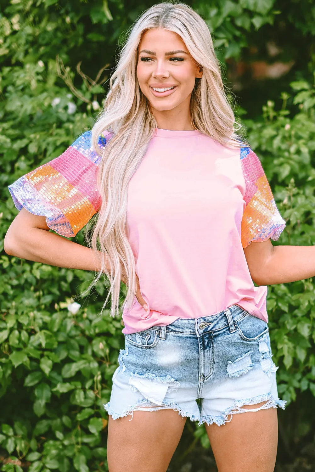 Sequin Round Neck Short Sleeve Blouse